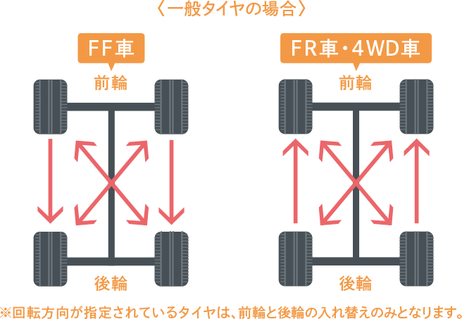 ローテーションの方法は自動車の駆動方法やタイヤの種類、タイヤの磨耗状況によって異なります。