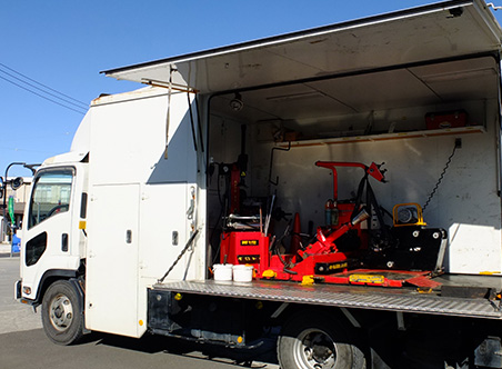 お客様の会社の駐車場やトラックターミナル等ご指定の場所にお伺いし、タイヤ交換や整備をいたします。乗用車から商用車、大型トラックまで対応できる最新鋭のタイヤ交換機器を搭載しています。